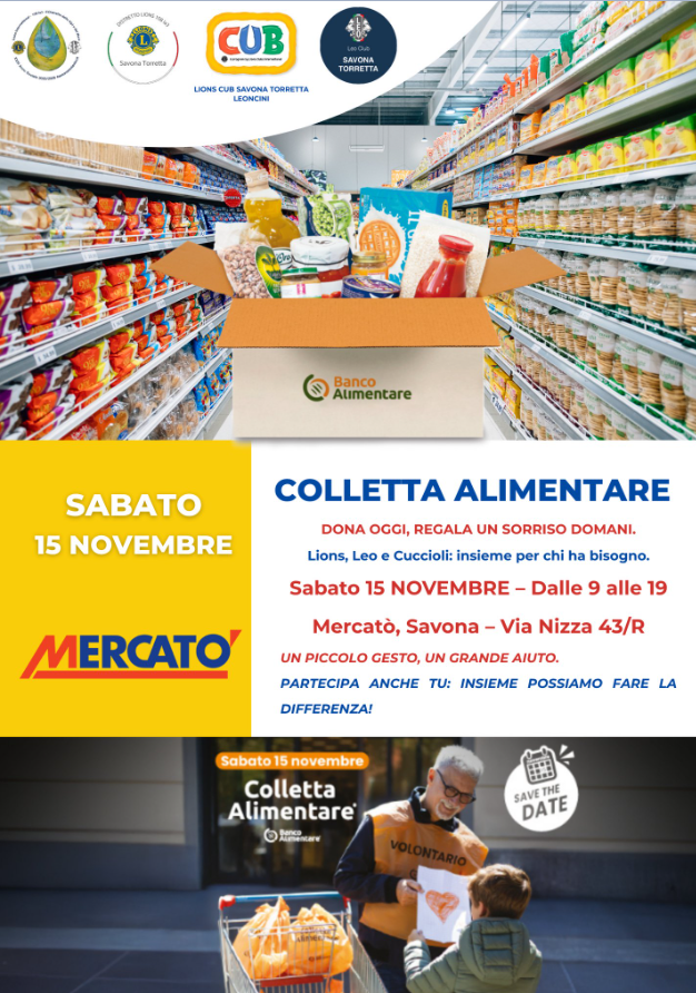Il Lions Club Savona Torretta desidera esprimere un sincero ringraziamento alla comunità savonese per la straordinaria adesione alla Colletta Alimentare del 15 novembre, svoltasi anche quest’anno presso il Mercatò di Via Nizza. La generosità di tante persone ci ha permesso di raggiungere quasi 1200 kg di generi alimentari, un risultato che conferma quanto la nostra città sappia essere vicina a chi sta vivendo un momento di difficoltà.