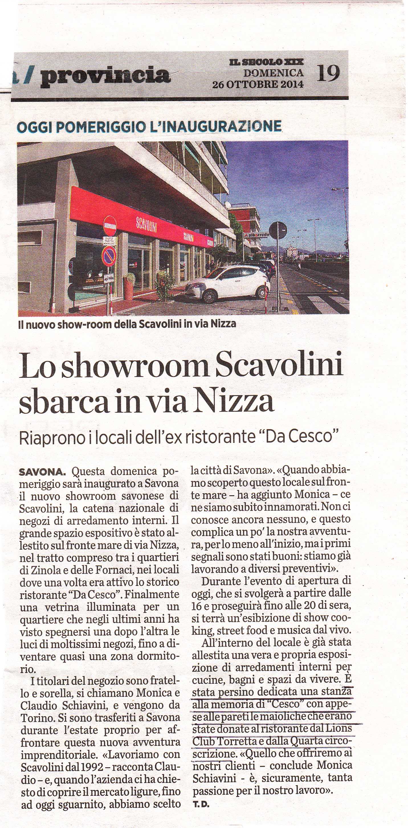 sicuro di farvi piacere segnalo un articolo del Secolo XIX di oggi (26 ottobre) nel quale in occasione dell’inaugurazione dello “Store Scavolini” nei locali di mio suocero in Via Nizza, nostra Storica Sede, viene ricordata la collaborazione tra il nostro Club Torretta e lo storico Ristorante “da Cesco”.